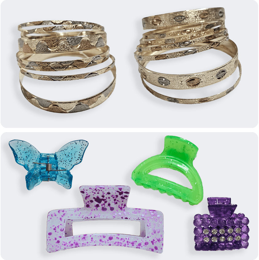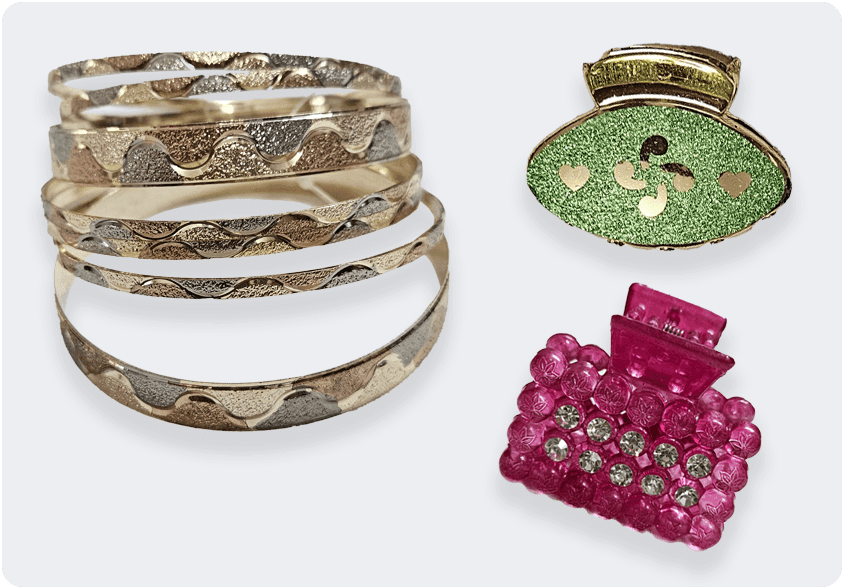 Beyond bangles, our Hair Accessories line unveils a diverse collection. From hair clutches to claws, our designs span the spectrum from plain to diamond, gold-plated, and unbreakable styles. Personalization options further allow you to make a unique statement.